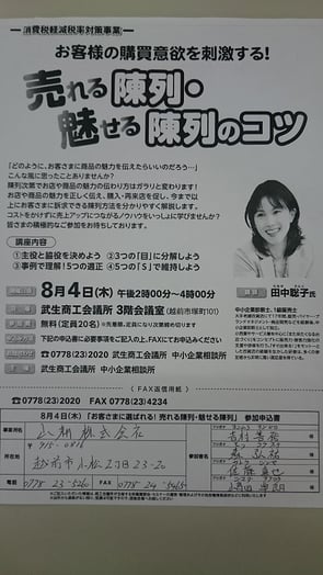 本日午後、武生商工会議所主催の研修に参加させていただきました。山耕からは私を含め若手4人の参加でした。“売れる陳列・魅せる陳列のコツ”という内容で、主に陳列の基本を学ばせていただきました。その中でも、陳列とは感性ではなく手順ですよ、との講師の先生のお話を聞き、それならできるかな、みんなで手順を考えよう!と参加したメンバーで話していました。